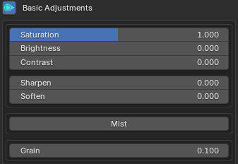 Toggling the Basic Adjustments switch will show a menu where you can perform basic colour adjustments, add grain or add mist/fog.