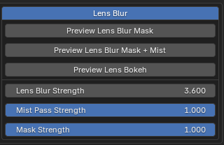 The lens blur strength is controlled with an edge or distance (mist) mask. As stated before, Mist effects are only preview-able while using Eevee. The masks can be viewed with the Preview Lens Blur Mask (Edge Mask) or Preview Lens Blur Mask + Mist (Edges and Distance).