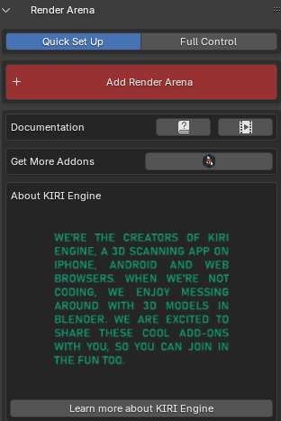 From the Quick Set Up menu, you can also access resources such as written or video documentation, our addon market page or the KIRI Engine home page using their corresponding buttons.