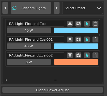 Below this, all lights in the scene are listed, whether added by the addon or not.