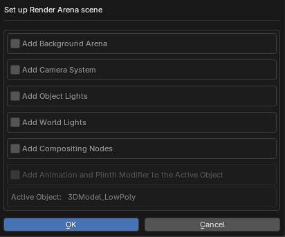 If the Render Arena Object is not found in the scene or has been renamed you will be shown options to pick a style and add the object with Append Render Arena Object.