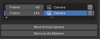 With at least one camera 'bound' to a marker, you will see all bound camera Markers listed below. From here you can quickly adjust their frame or remove a marker.