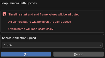 From here you can specify the desired Path Speed. All paths will be given the same speed, and the timeline length will be adjusted to make the camera move loop seamlessly.