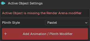 If the Render_Arena_Main_Object modifier hasn't been added to the Active Object yet, a warning will show, and the button Add Animation / Plinth Modifier as well as a Plinth preset style will be shown.