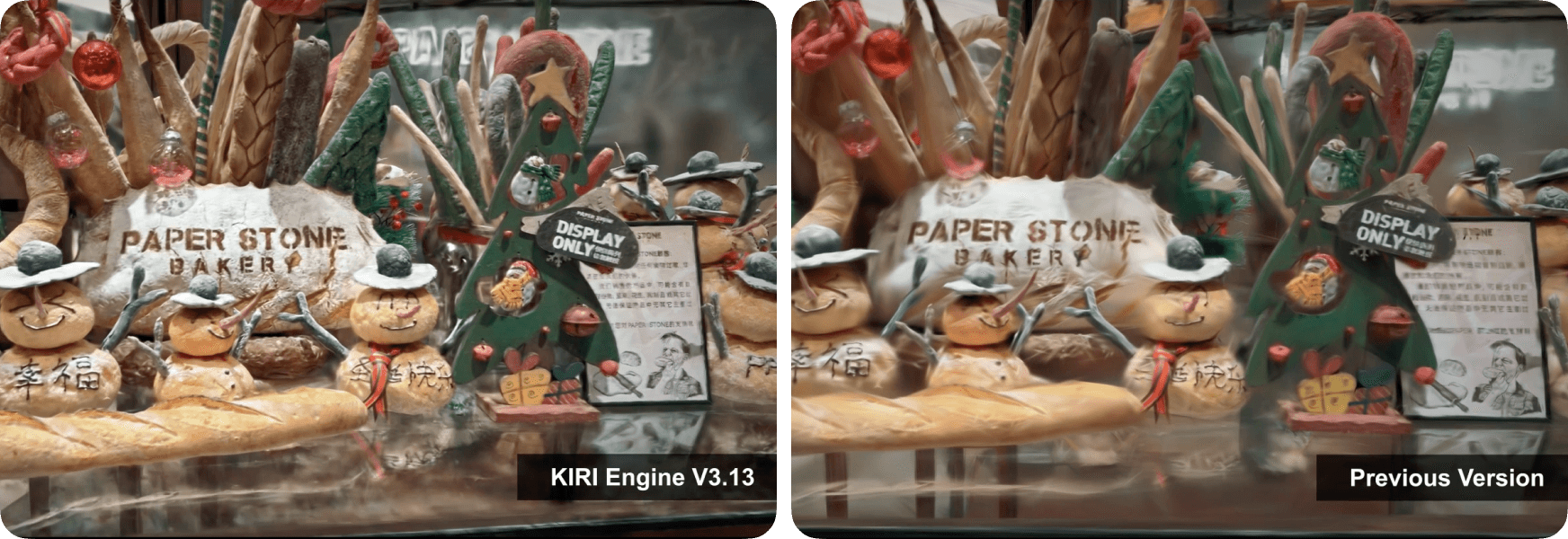 Results of KIRI's updated High Fidelity 3DGS (middle) and the 3DGS from two other scanner apps (left and right) using the same input.